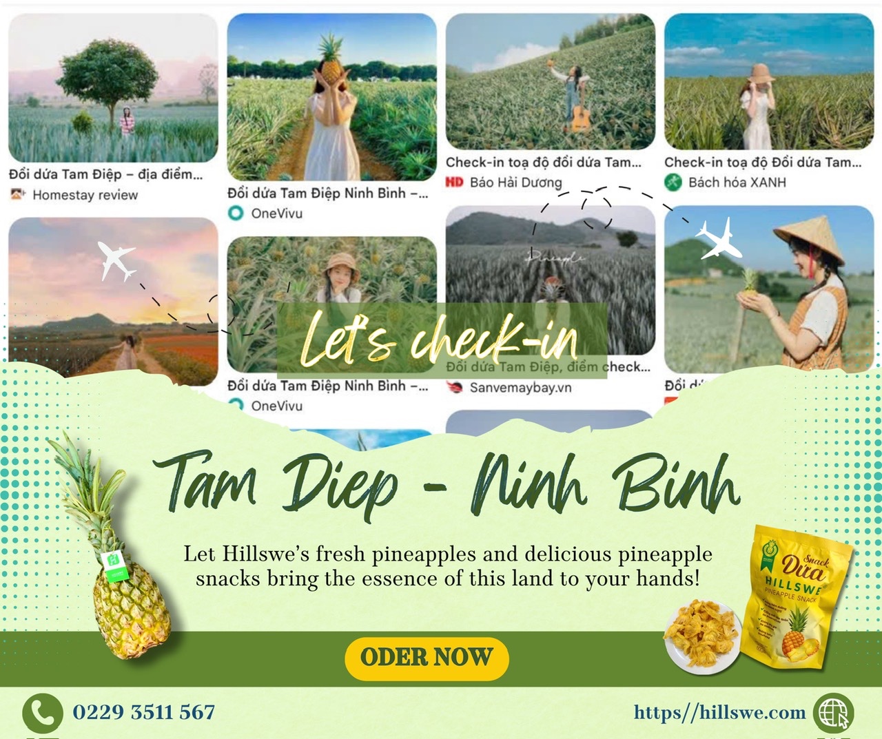 Mùa check-in đẹp nhất tại đồi dứa Tam Điệp, Ninh Bình đang đến. Từ tháng 4 đến tháng 7 hàng năm, những cánh đồng dứa xanh mướt trải dài, rực rỡ trong nắng vàng. Hãy để trái dứa tươi Hillswe và snack dứa thơm ngon của chúng tôi mang trọn hương vị của vùng đất này đến tay bạn!